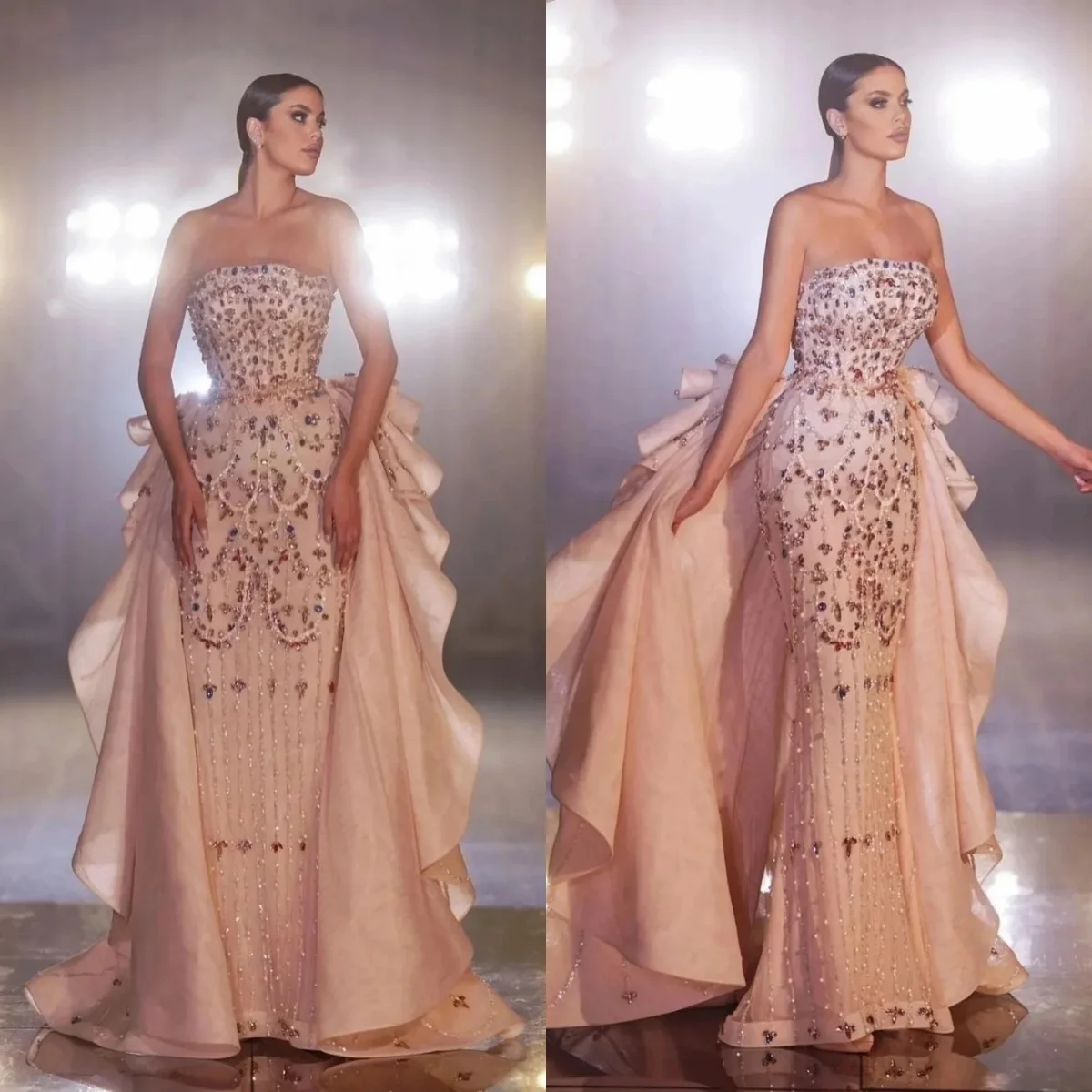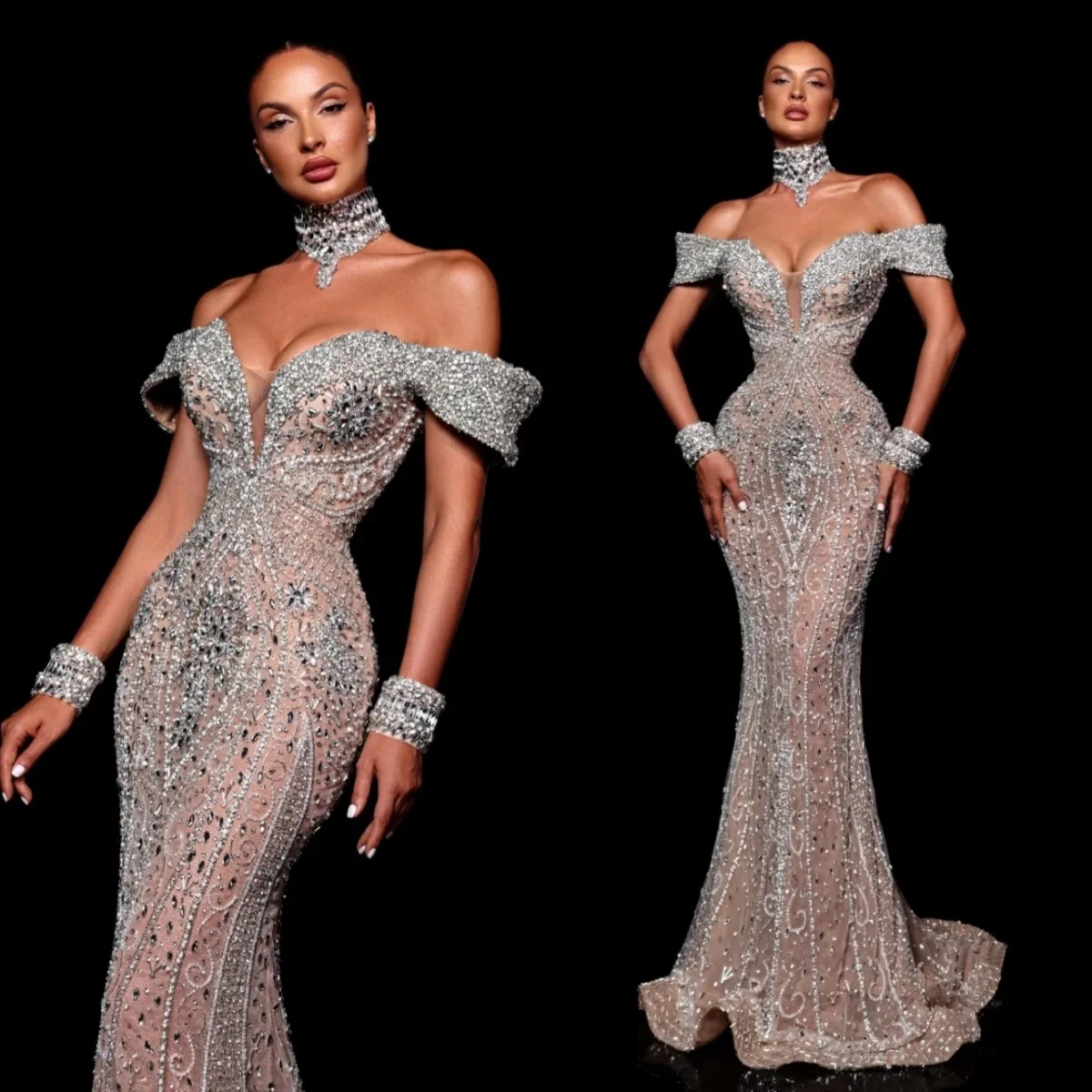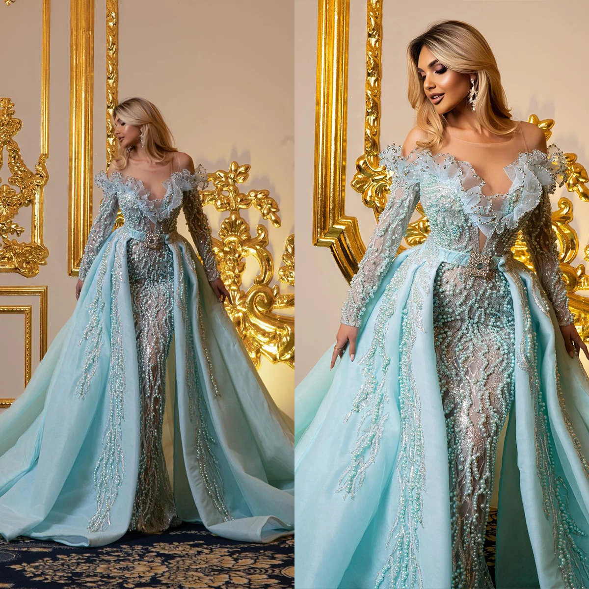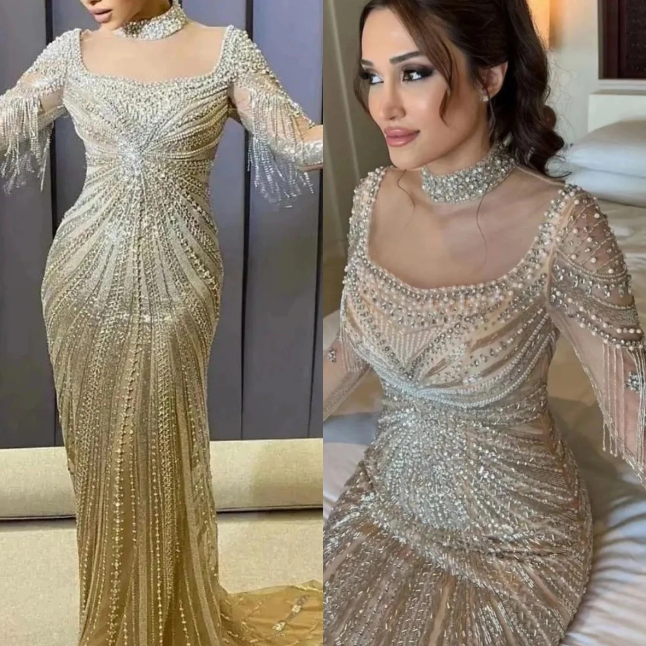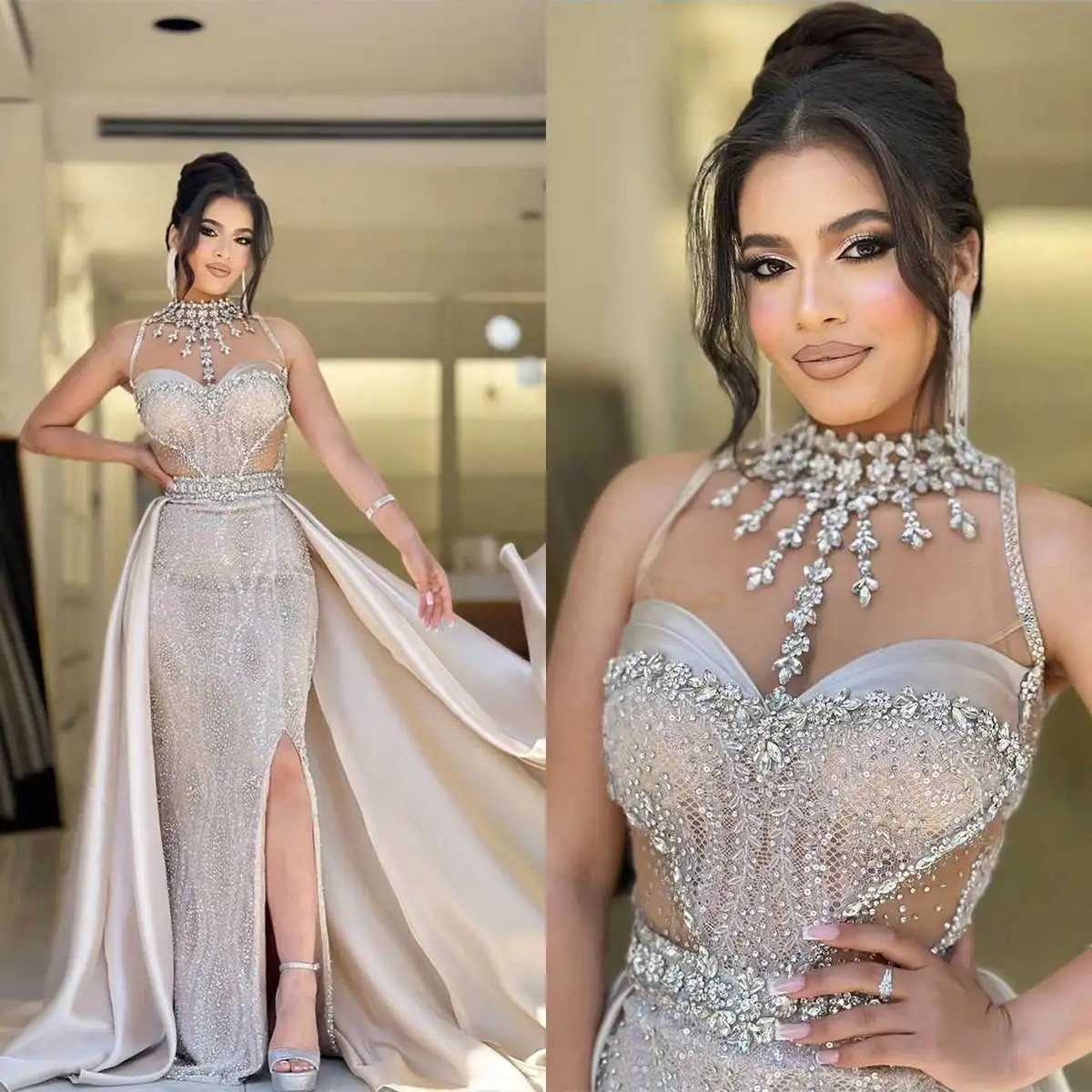 فساتين سهرة رائعة حورية البحر بياقة عالية وأكمام طويلة فستان كريستالي ترتر قابل للانفصال فستان مخصص للحفلات