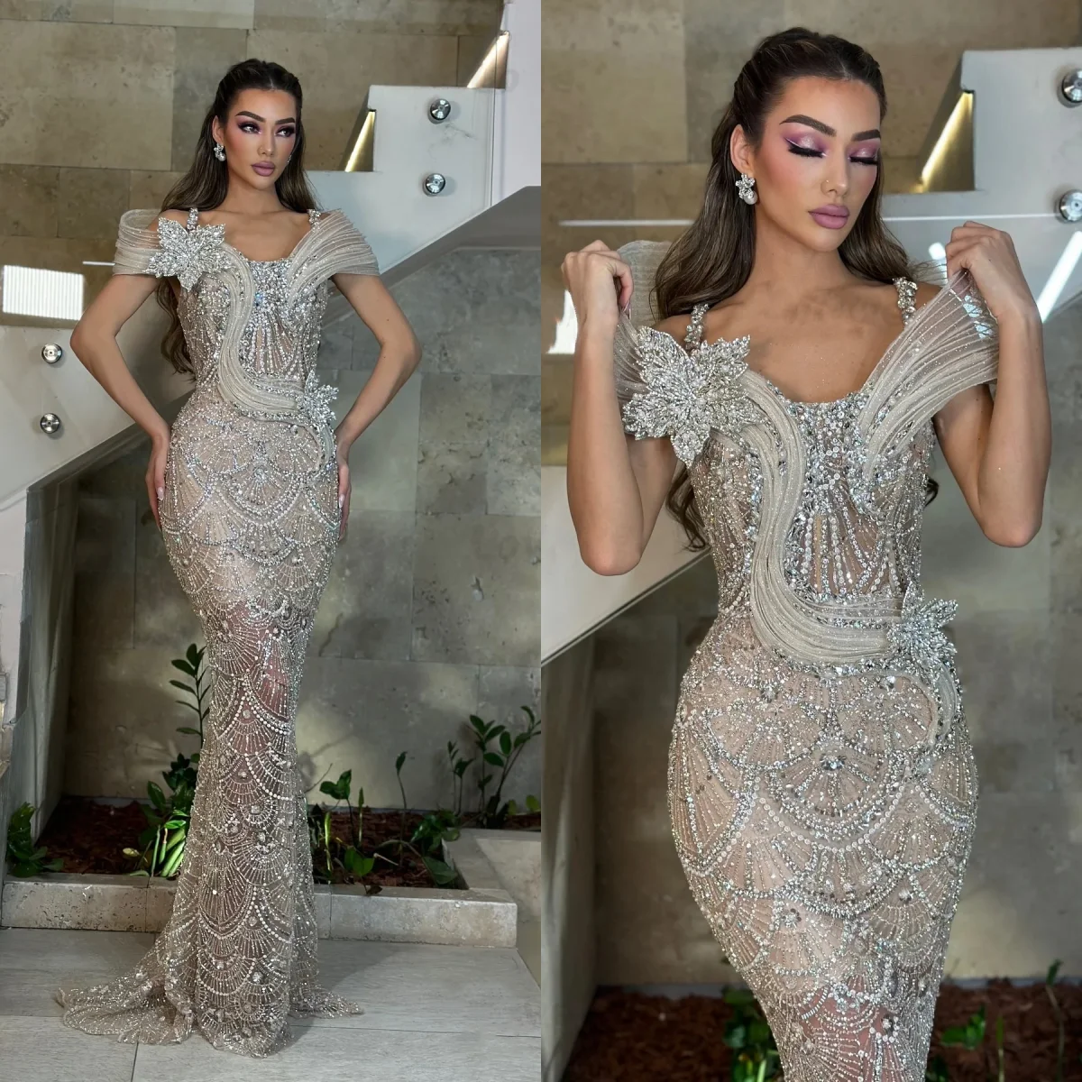 فساتين لحضور الحفلات الموسيقية الفاخرة مطرز مع الأشرطة طويلة حورية البحر فساتين سهرة طوق مربع كريستال تألق الترتر فستان الحفلات