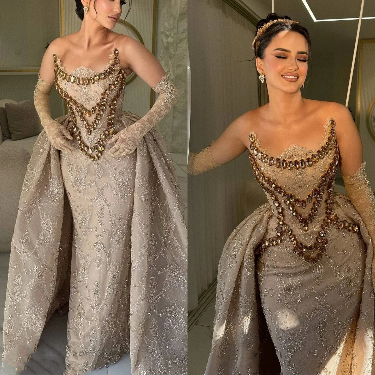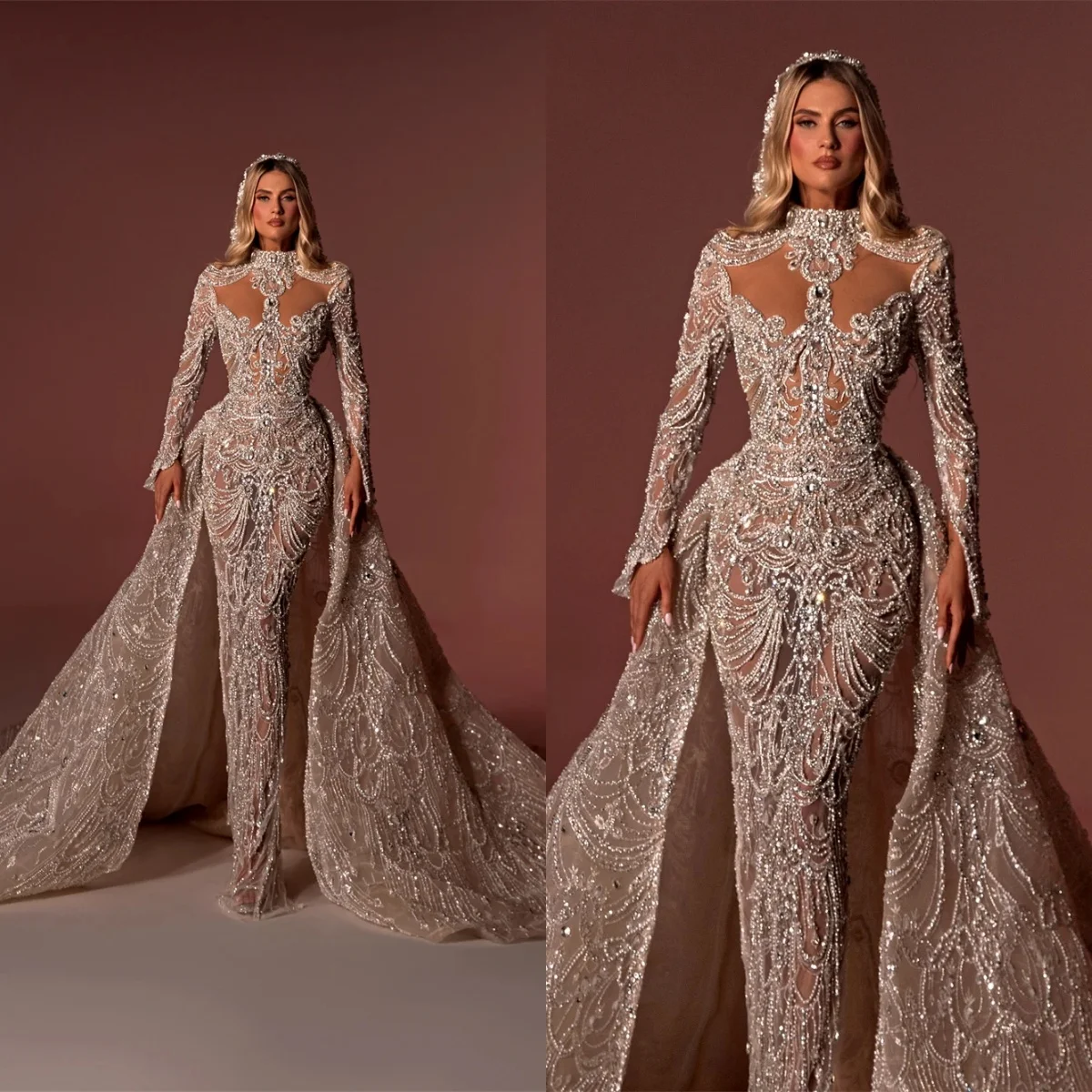 فساتين سهرة رائعة حورية البحر بياقة عالية وأكمام طويلة فستان كريستالي ترتر قابل للانفصال فستان مخصص للحفلات