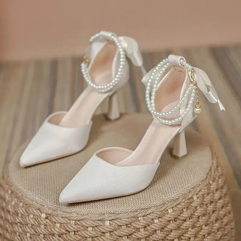 أسود عالية الكعب أحذية الزفاف خادمات 2025 جديد كعب رقيقة ماري جين حذا فردي للسيدات اللؤلؤ الجوف رئيس الصنادل للنساء