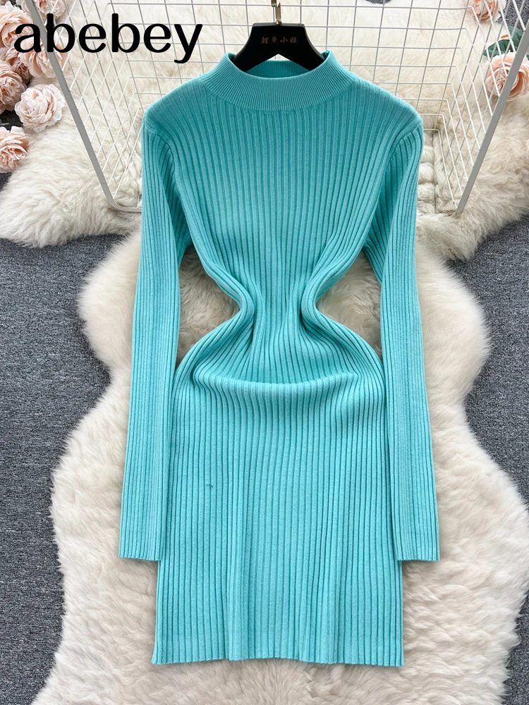فستان نسائي قصير محبوك ، نصف ياقة ، رقبة ، مثير ، نحيل ، مرن ، أساسي ، ملاصق للجسم ، سترة ، دافئة ، شتاء ، خريف