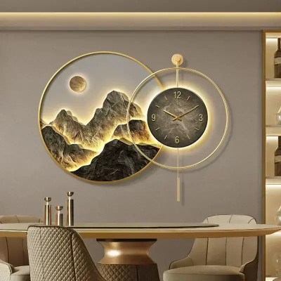 اللوحة الزخرفية مع ساعة الظهر معلقة الراقية غرفة المعيشة مصابيح إضاءة للمناظر الطبيعية الساعات الجدارية الفاخرة ديكور جدران المنزل
