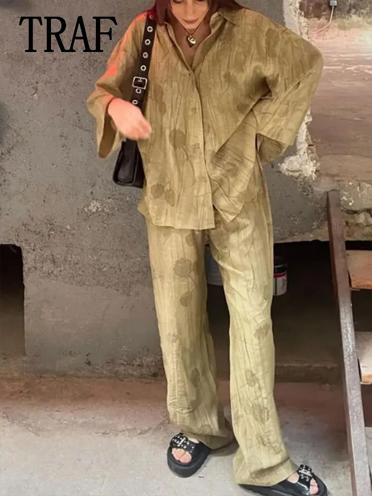 أطقم سراويل طويلة مطبوعة للنساء قمصان طويلة نصف كم ذات صدر واحد + سراويل واسعة الساق برباط عالي الخصر