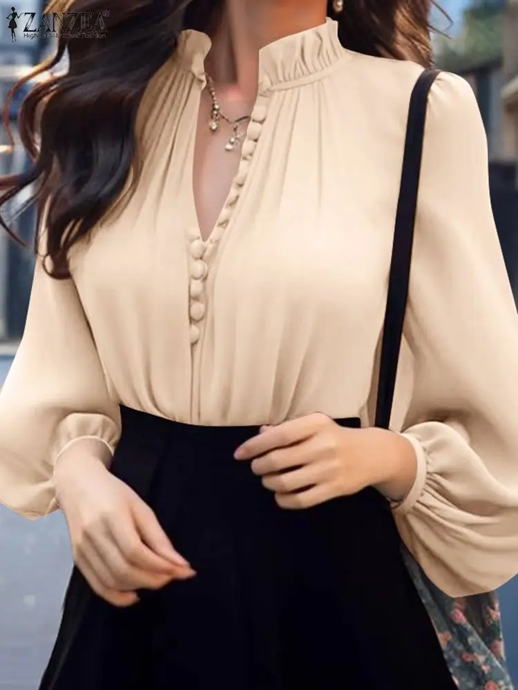 ZANZEA-قمم فانوس طويلة الأكمام ، قميص فضفاض برقبة حرف V ، ياقة قائمة عتيقة بسيطة ، بلوزة مكتب ، قميص أنيق ، موضة غير رسمية ،