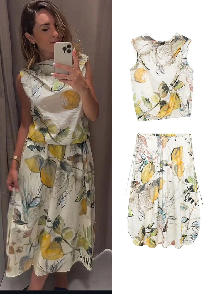طقم تنورة نسائية مطبوعة على طراز الشاطئ TFMLN طقم تنورة أنيقة بدون أكمام + أزرار عالية الخصر تنورة متوسطة الطول