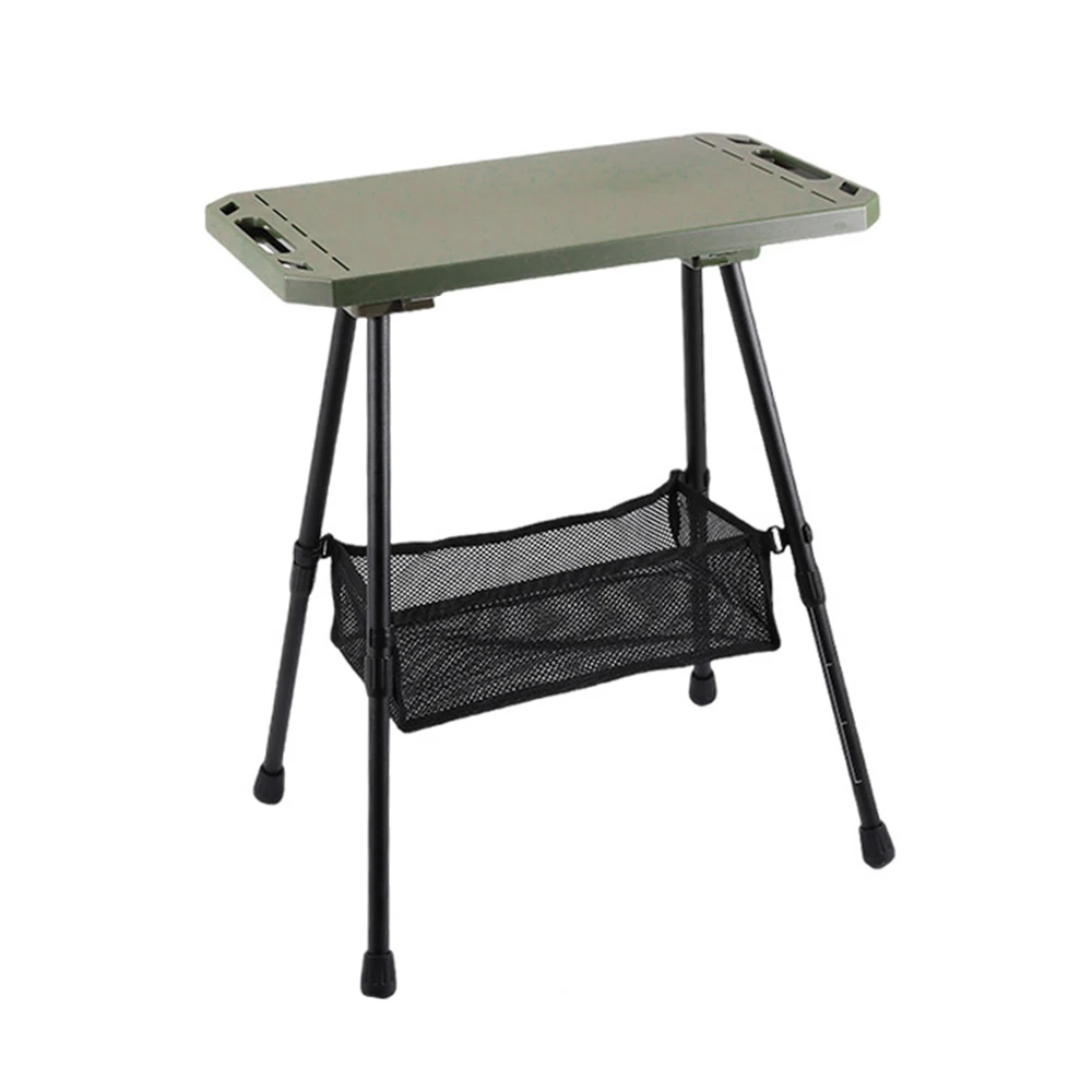 طاولة تخييم قابلة للطي بارتفاع قابل للتعديل، مصممة للاستخدام الخارجي، تتميز بخفة وزنها، وتأتي مع حقيبة حمل جانبية، مما يجعلها مثالية للأنشطة المتنوعة مثل تجهيزات المطابخ المعلقة، والمشي لمسافات طويلة، والنزهات.