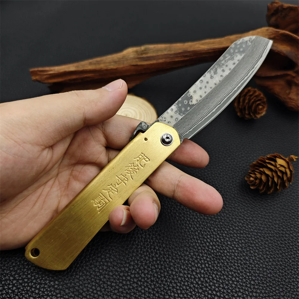 سكين الجيب الياباني هيغونوكامي، المصنوع من الفولاذ الدمشقي VG10، مثالي للتخييم والصيد. يتميز بمقبض نحاسي، وهو أداة EDC أساسية للبقاء في الأماكن المفتوحة.