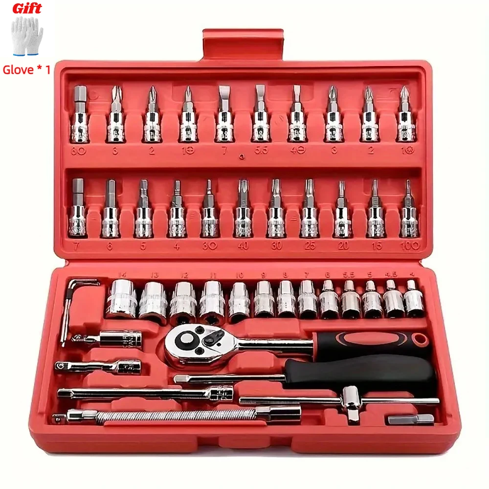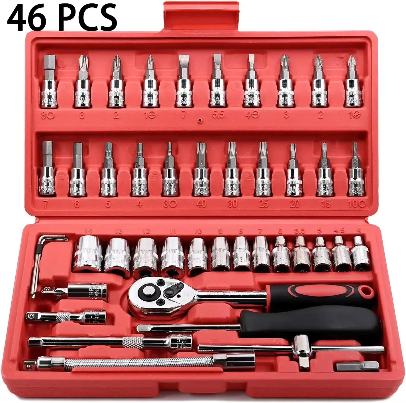 طقم أدوات ميكانيكية مكون من 46 قطعة، يتضمن مجموعة مقابس ومفتاح ربط بسقاطة بمقاس 1/4 بوصة، ومجموعة رؤوس مفكات.