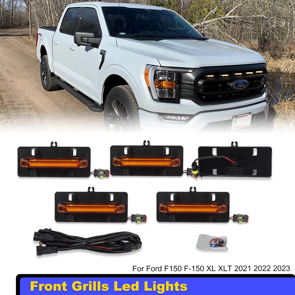 إكسسوارات السيارات: الشوايات الأمامية المزودة بإضاءة LED لسيارات فورد F-150 XL و XLT موديلات 2021، 2022، و 2023، مع شريط إضاءة LED ومصباح LED باللون الأصفر.
