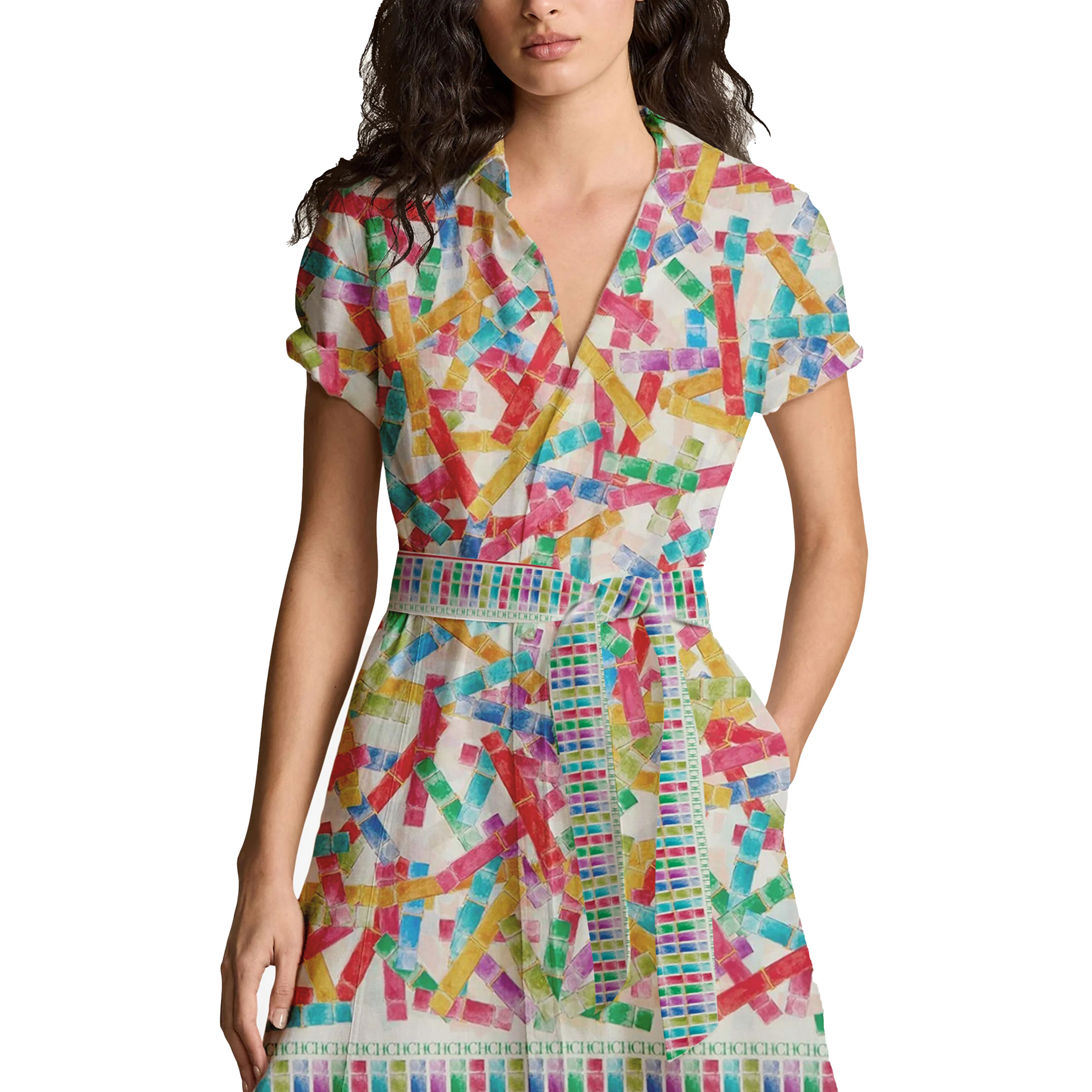 فستان CHCH الصيفي الأنيق المطبوع للسيدات، يتميز بتصميم عصري وياقة مدببة وأكمام نصفية، مع صف أزرار أمامي، ضمن تشكيلة ملابس المخصصة للتنقل.