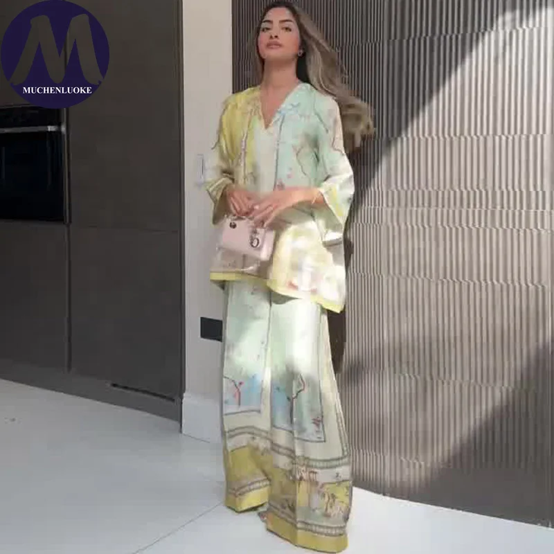 طقم نسائي صيفي جديد مكون من قطعتين، يتميز بتصميم أنيق وعصري، يشتمل على بلوزة مطبوعة بأكمام طويلة ورقبة على شكل V، وبنطال واسع الساق وقصّة فضفاضة، مما يجعله خيارًا مثاليًا للإطلالات الكاجوال والمريحة.