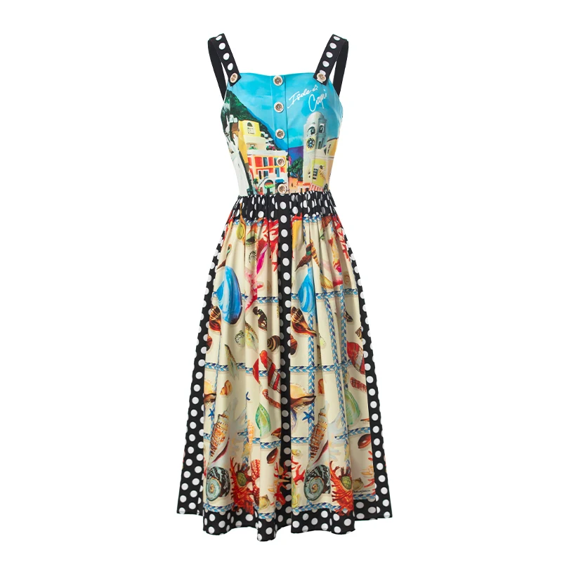فستان نسائي أنيق بتصميم مطبوع ومزود بإبزيم، يتميز بنمط حيوانات بحرية، يعكس الأسلوب العصري ويأتي بتصميم سلسلة، مثالي لأزياء الصيف الأنيقة والمناسبات الرومانسية.