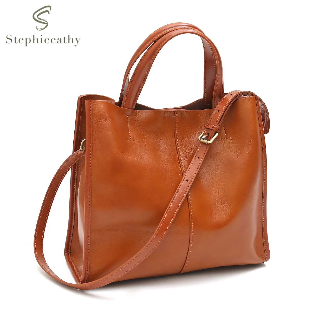 حقيبة يد نسائية كلاسيكية مصنوعة من الجلد الطبيعي، تتميز بتصميم بسيط بمقبض علوي، وتوفر سعة تخزين كبيرة، مع إمكانية استخدامها كحقيبة كتف أو حقيبة كروس، مما يجعلها متعددة الاستخدامات.