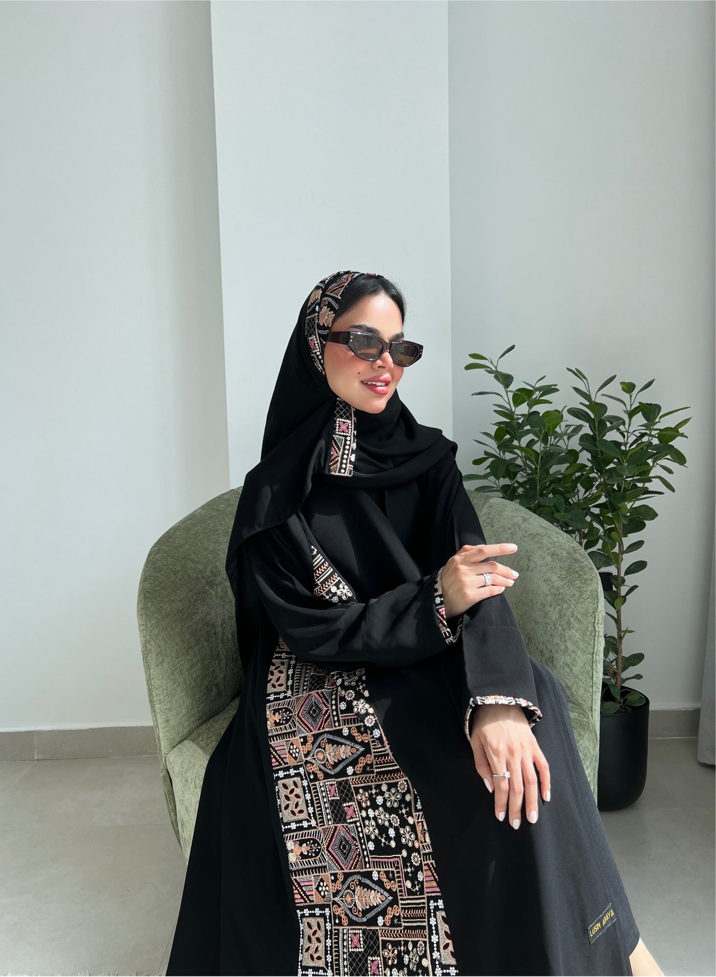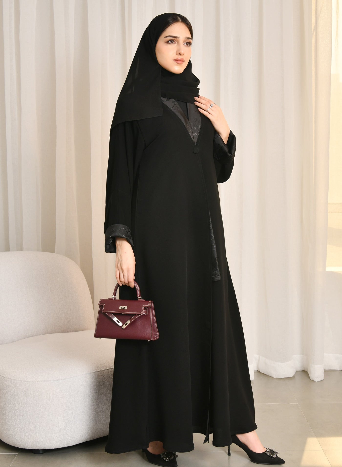 عباية سوداء بتداخل قماش الجاكار الصيفي على الياقة الداخلية والاكمام الدبل