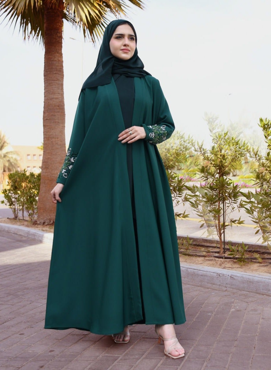 عباية لف ربع كلوش باللون الاخضر بشك يدوي على الأكمام