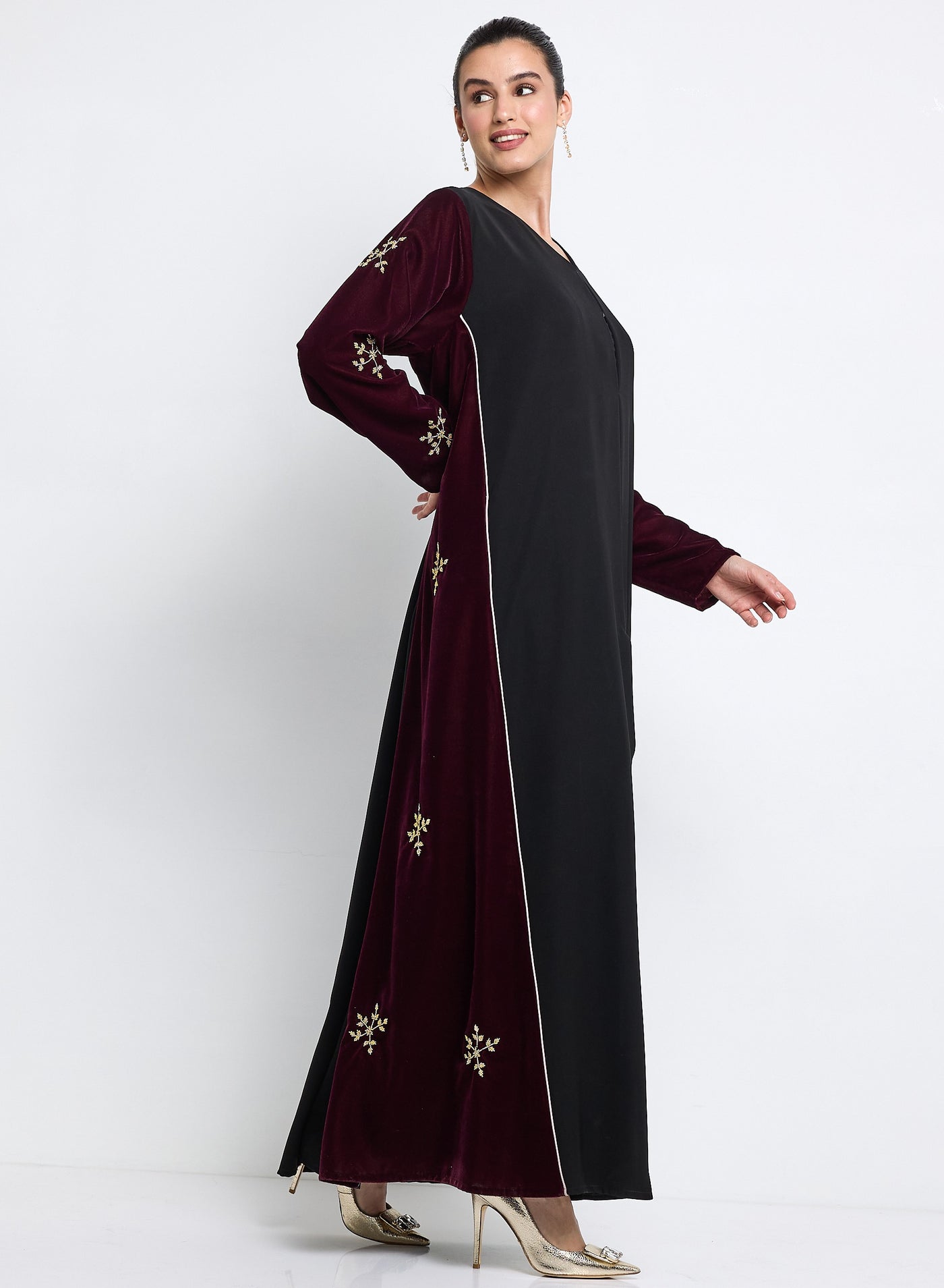 عباية مخملية باللون العنابي مع تطريز وتصميم الجوانب + شيللا