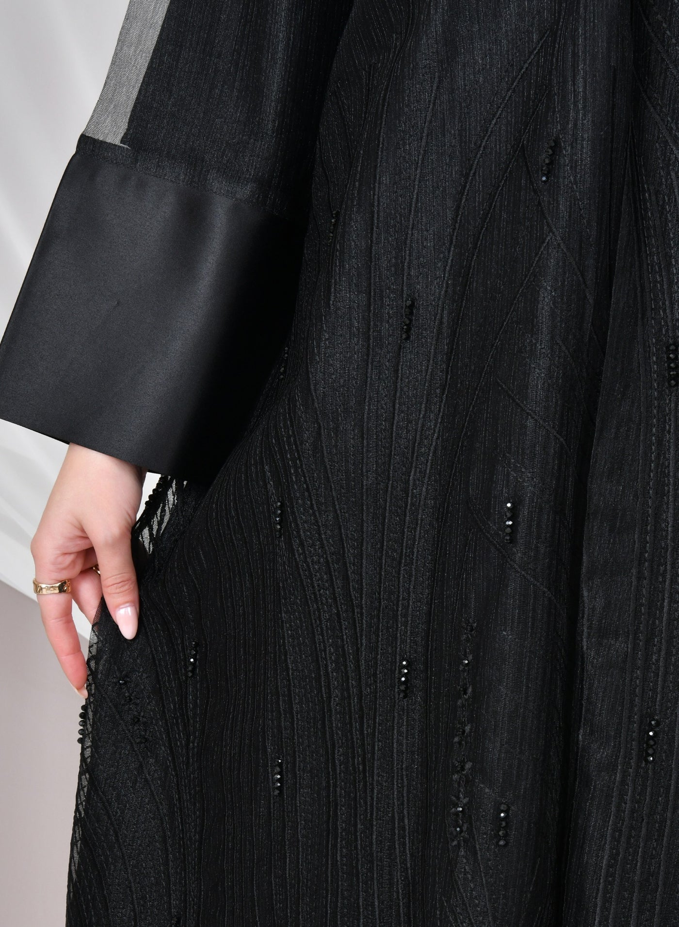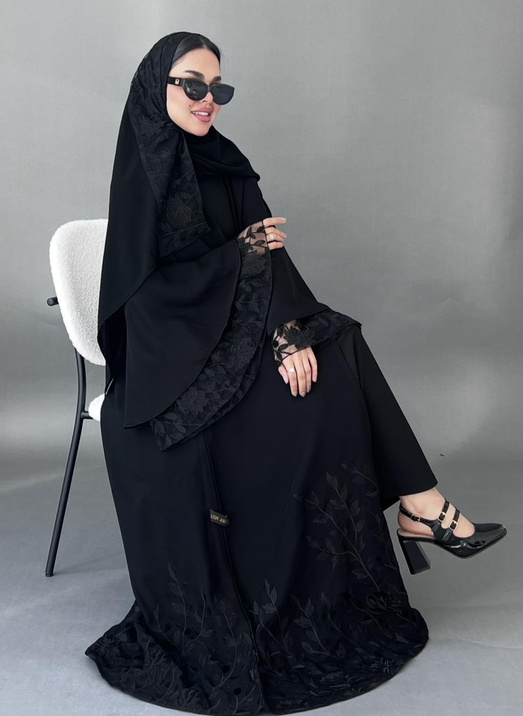 عباية سوداء بتطريز أسود وأكمام تل مطرز