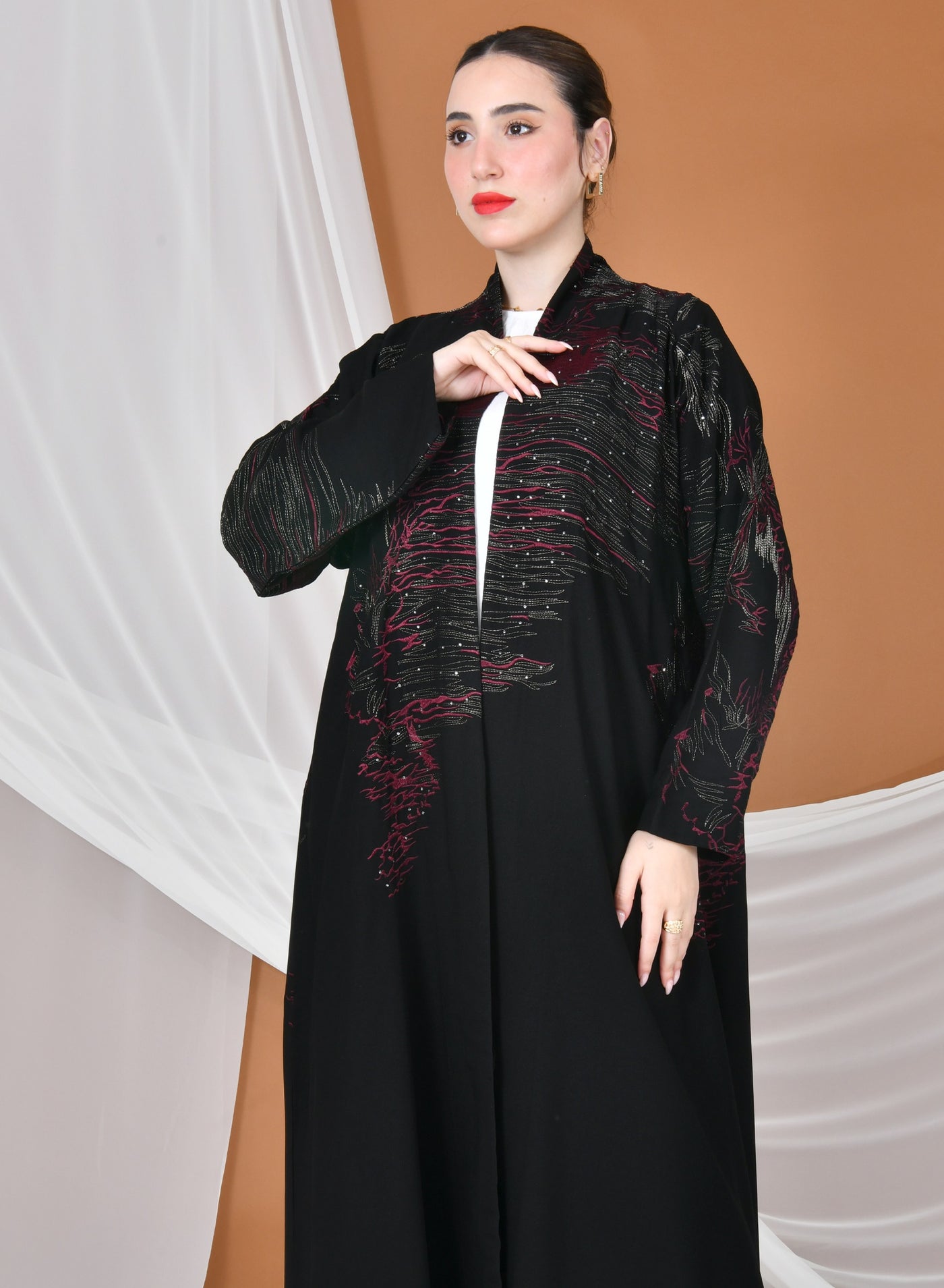 عباية لف سوداء بقصة انسيابية بتطريز ذهبي وعنابي مزينة بفصوص