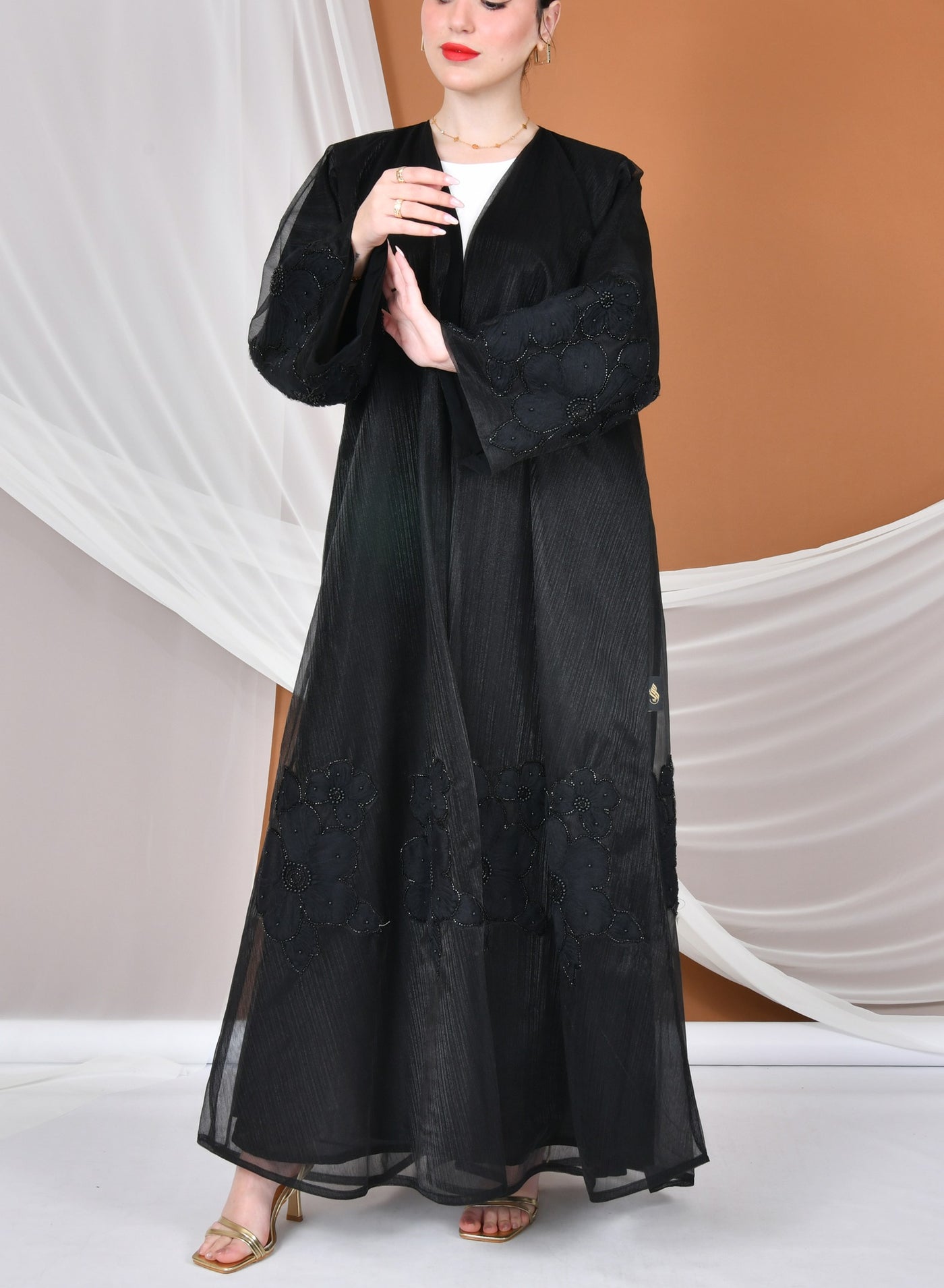 عباية لف سوداء ربع كلوش بقماش الاورقانزا مزينة بتل زهري وشك