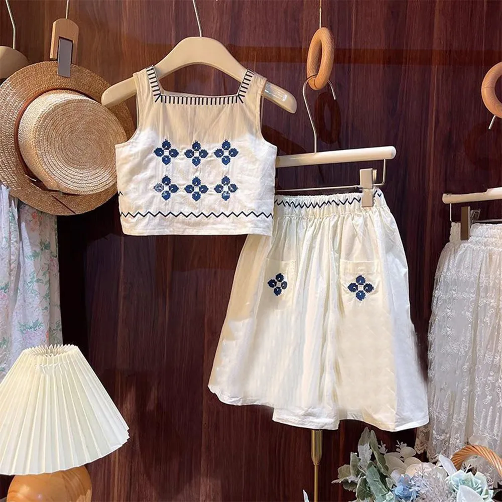 سترة علوية ومطرزة بدون أكمام وتنورة للفتيات ، مجموعة من قطعتين للأطفال مع جيوب ، ملابس صيفية