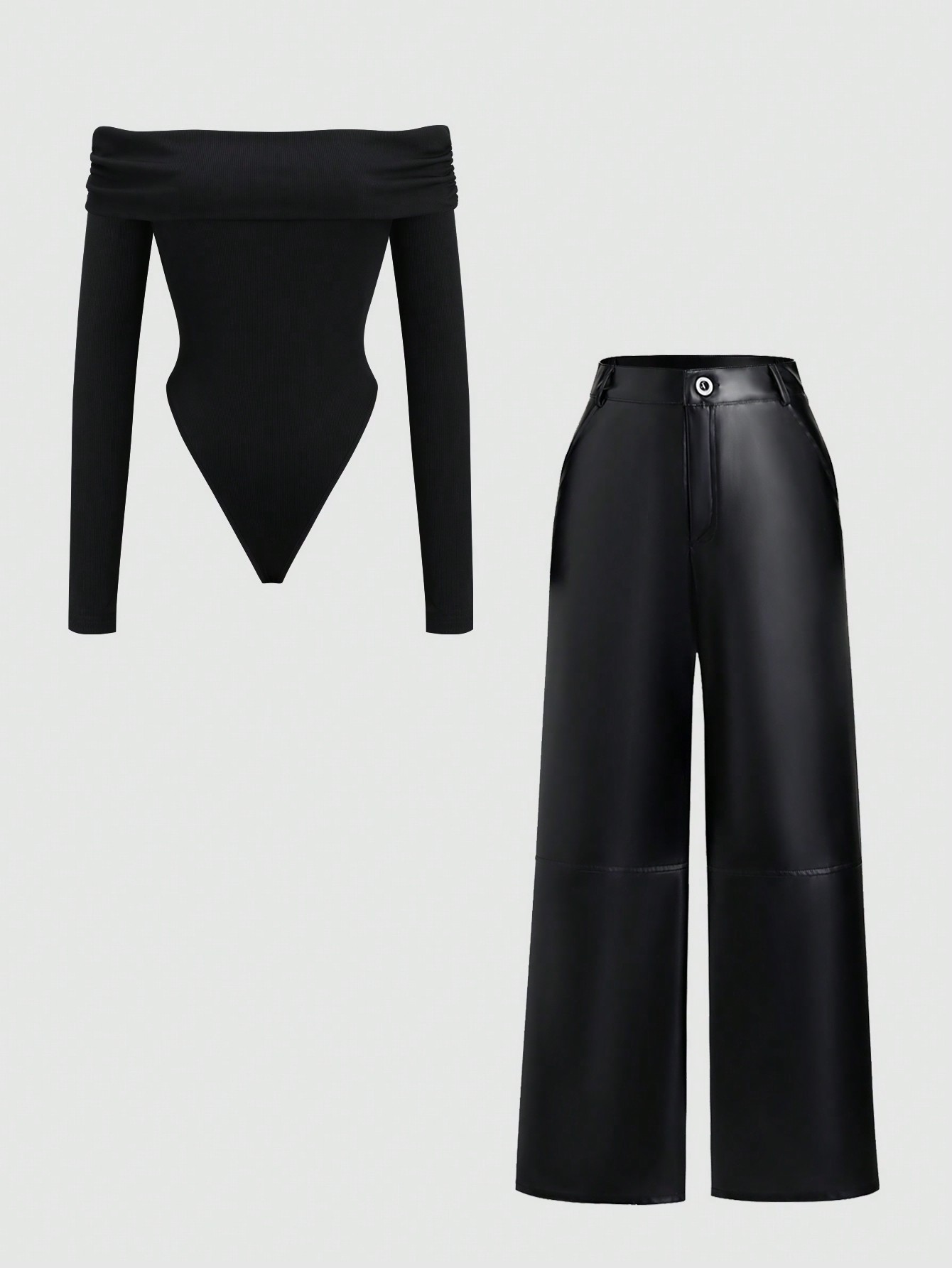 Sweetra مجموعة من قطعتين,بدلة قفز طويلة الأكمام منكشفة الكتف و بنطلون من جلد PU كاجوال