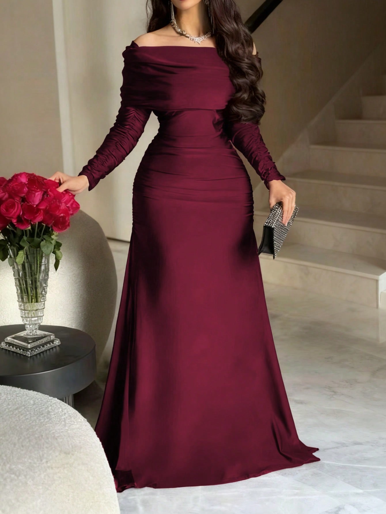 فستان سهرة أنيق بتصميم كتف مكشوف بلون أحمر داكن، قماش أنيق مناسب للحفلات الرسمية في فصلي الخريف والش