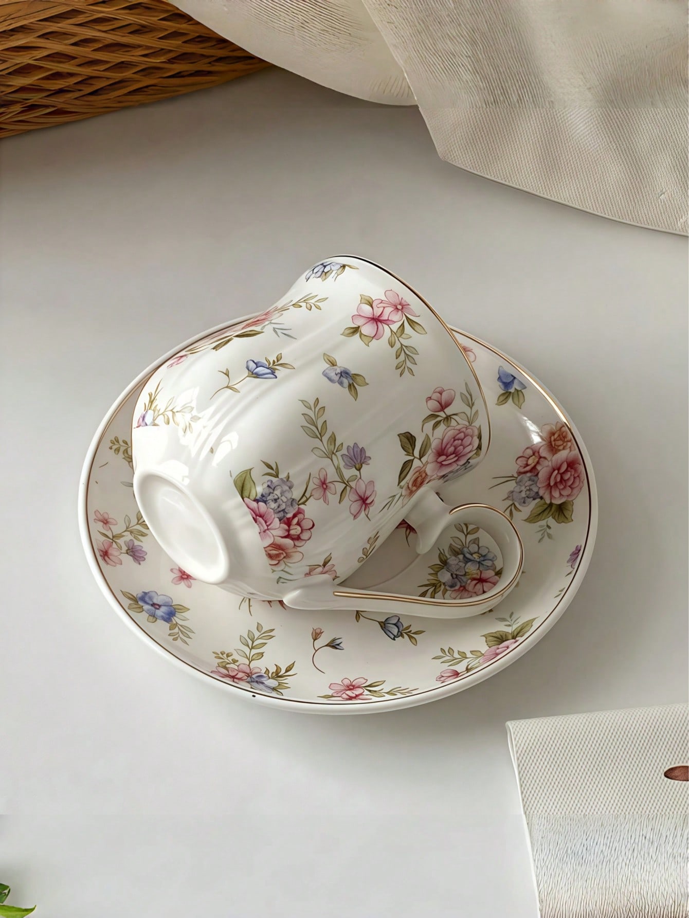 طقم أكواب خزفية فاخرة بحواف ذهبية، كوب مع رضاضة وملعقة، سعة 95مل/3.32 أونصة، كوب شاي بعد الظهر على ا