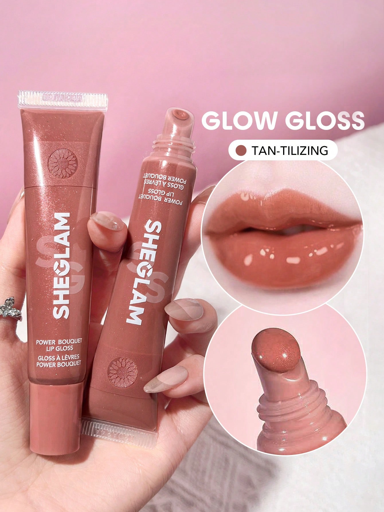 SHEGLAM ملمع شفاه Power Bouquet-ملمع شفاه مرطب ملون لامع بلون بني فاتح مع زيت شفاه غير لاصق لإصلاح ا