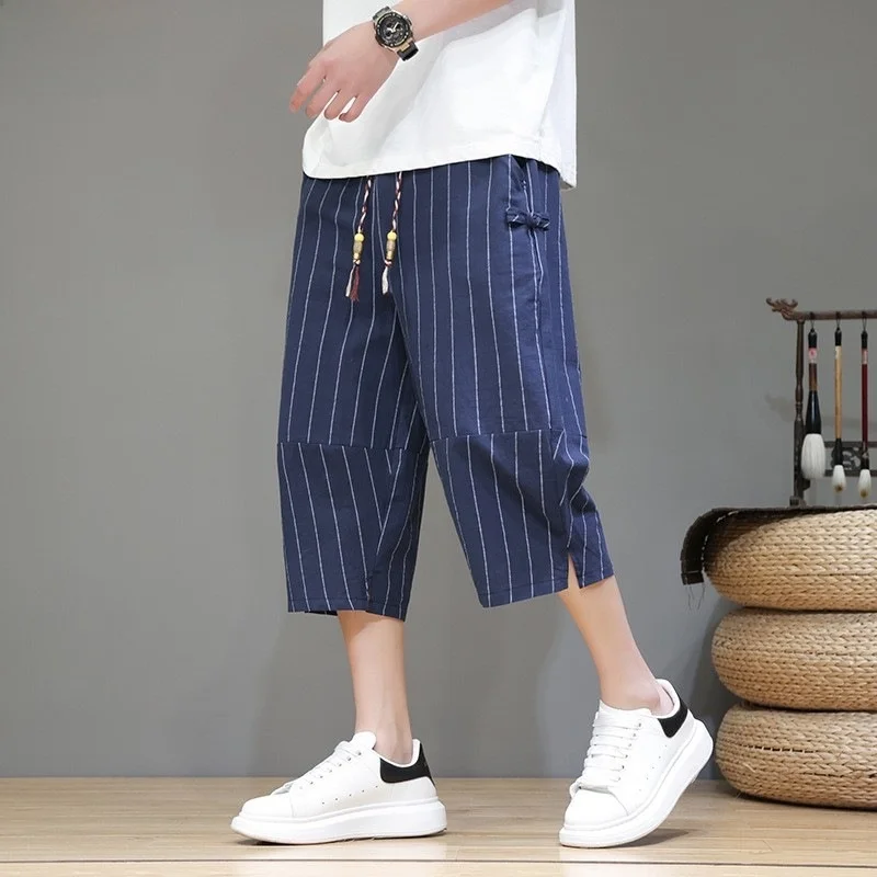 النمط الصيني فضفاض بنطال ذو قصة أرجل واسعة الرجال الصيف السراويل الكاكي مخطط Harajuku فانوس السراويل عادية فضفاض صالح مستقيم أنبوب Tr...