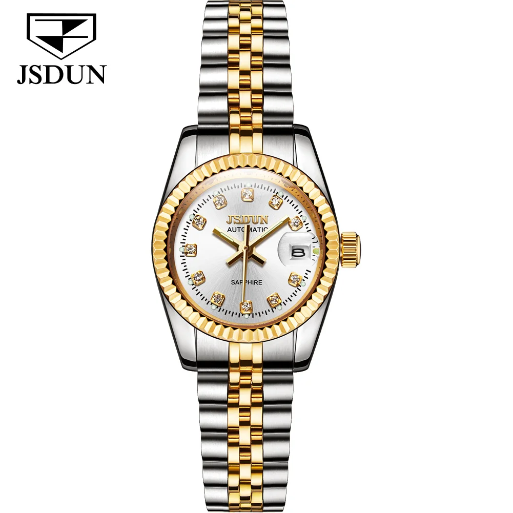 JSDUN ساعة نسائية أوتوماتيكية ماركة فاخرة أصلية مرآة الياقوت مقاوم للماء تاريخ تلقائي ساعة معصم للنساء ساعات السيدات 8737