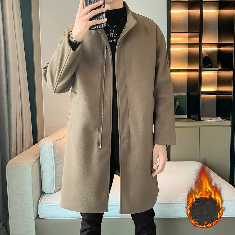 معطف رجالي طويل عصري للخريف والشتاء فضفاض مناسب أنيق معطف أسود للأعمال نمط غير رسمي سحاب إغلاق فراء أرنب مبطن