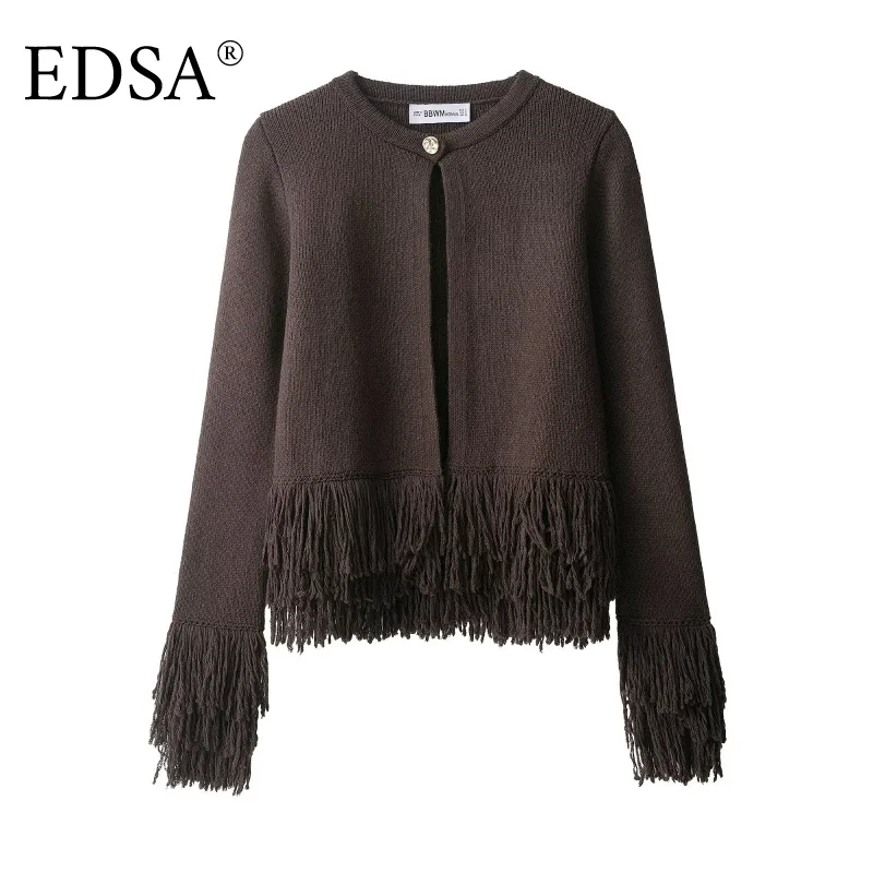 سترة نسائية محبوكة مهدب من EDSA مع زر واحد وأكمام طويلة ورقبة دائرية وغرزة مفتوحة