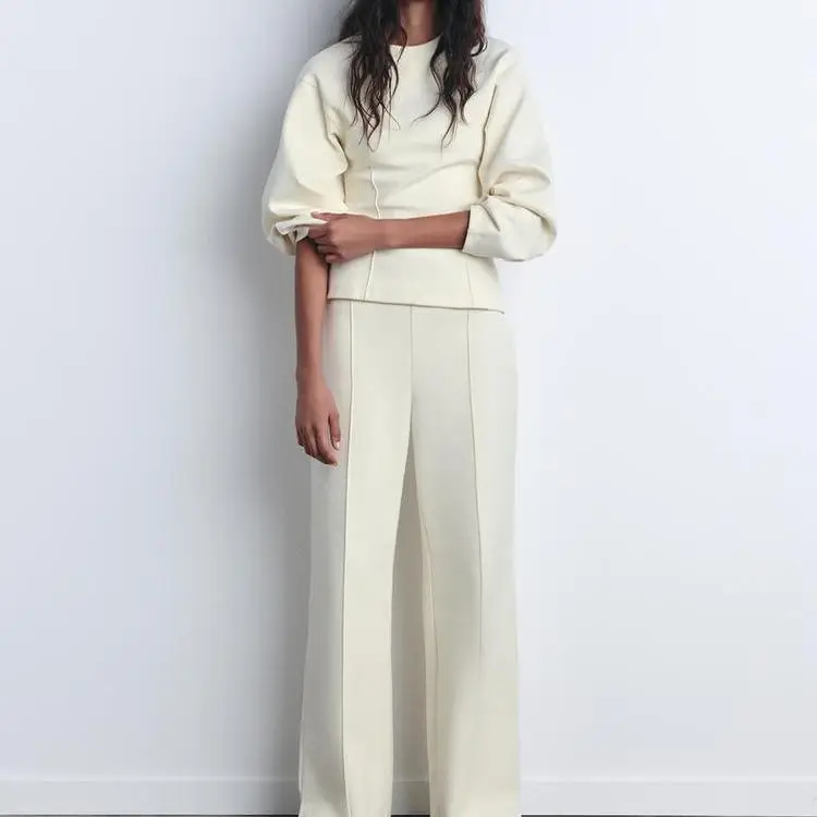 طقم نسائي أنيق للخريف والشتاء يتكون من بلوزة بأكمام طويلة وياقة مستديرة من قماش مزدوج الوجه مع بنطلون كاجوال بخصر مرتفع وساق ...