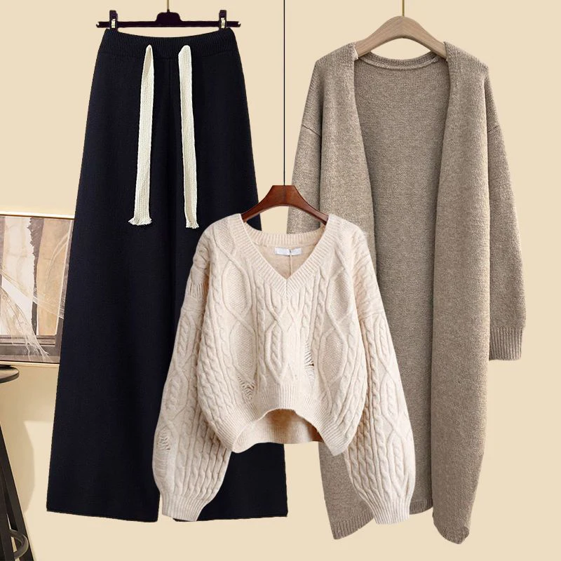 طقم نسائي ثلاثي القطع للخريف والشتاء: سترة محبوكة وبنطلون واسع الساق بخصر مرتفع وقميص فضفاض متعدد الاستخدامات برقبة مستديرة و...