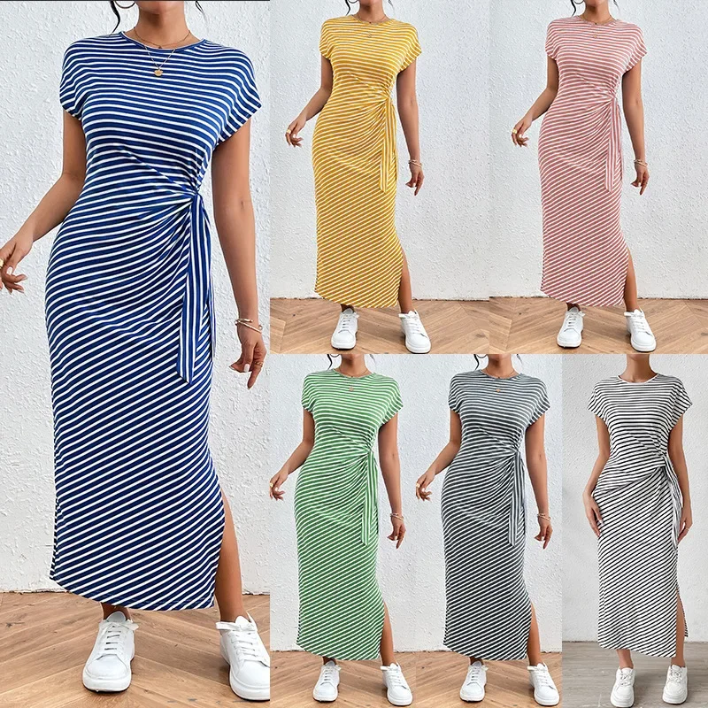 فستان نسائي مخطط مطبوع بأكمام جناح الخفاش ، فستان طويل غير رسمي قصير بعقدة أمامية ، ملابس صيفية للسيدات لعطلة الشاطئ