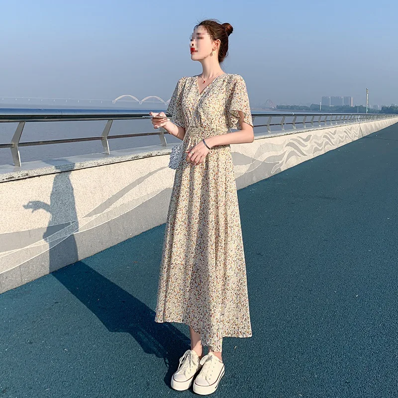 أنيقة الخامس الرقبة فستان طويل التخسيس الأزهار طباعة الجنية تنورة لطيف نمط البوليستر النسيج عالية الخصر قصيرة الأكمام فستان الصيف
