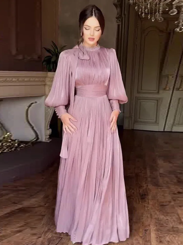 LGRQ 2025 الوقوف طوق فانوس الأكمام مطوي وصمة عار عالية الخصر فستان طويل البلوز الإناث فيستدو S-2XL