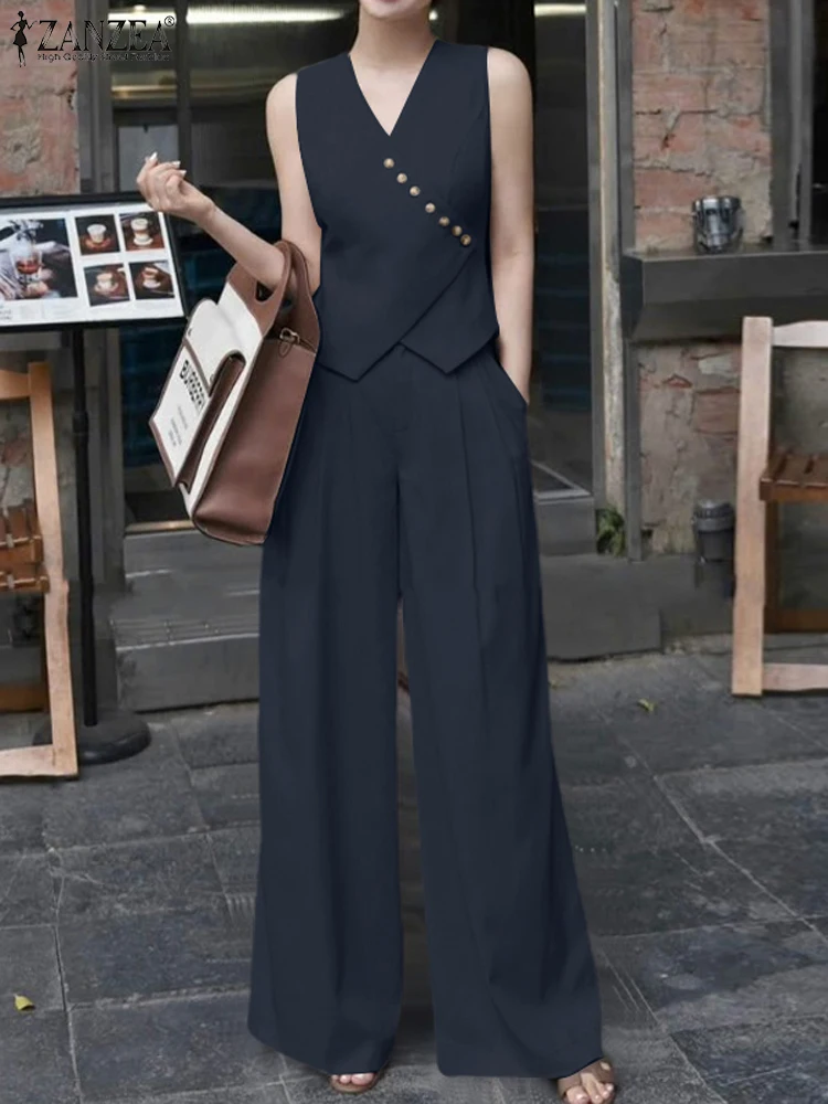 2 قطعة ملابس رياضية الموضة النساء الصيف بانت مجموعات ZANZEA أنيقة أكمام بلوزة OL العمل بنطلون الدعاوى الصلبة فضفاض مطابقة مجموعات