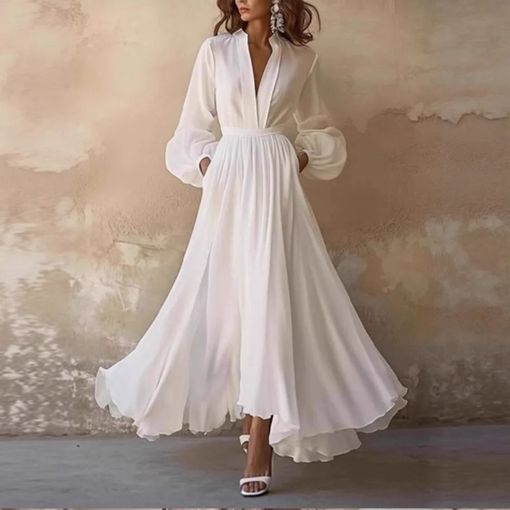 فستان أنيق ذو لون نقي مستقل مع تنورة طويلة مطوية وأكمام طويلة ورقبة على شكل حرف V على الطراز الفرنسي للنساء
