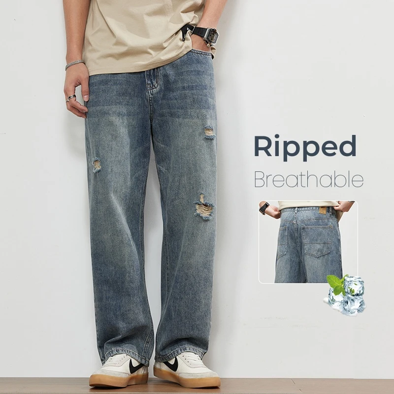 موضة ممزق الجينز الرجال الصيف رقيقة لينة مستقيم Vintage السراويل الشارع الشهير هول فضفاض عادية الذكور تنفس الدنيم السراويل