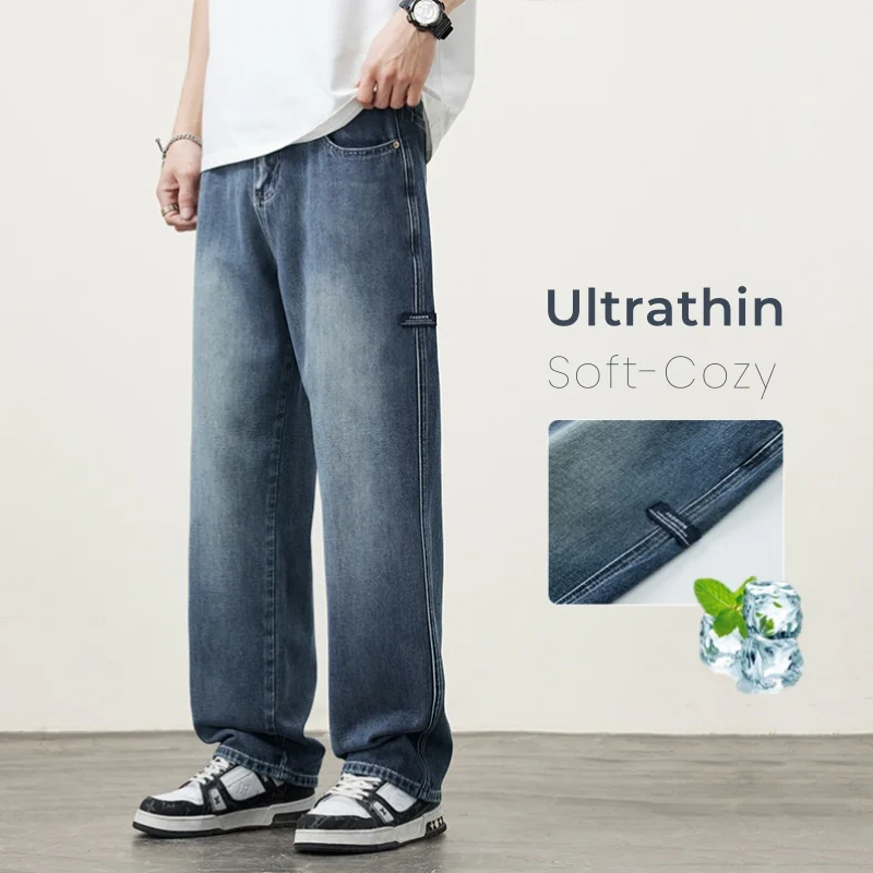 الصيف رقيقة الرجال جينز فضفاض غير رسمي تنفس الكورية موضة مستقيم بنطلون الشارع الشهير الذكور خمر الدنيم السراويل