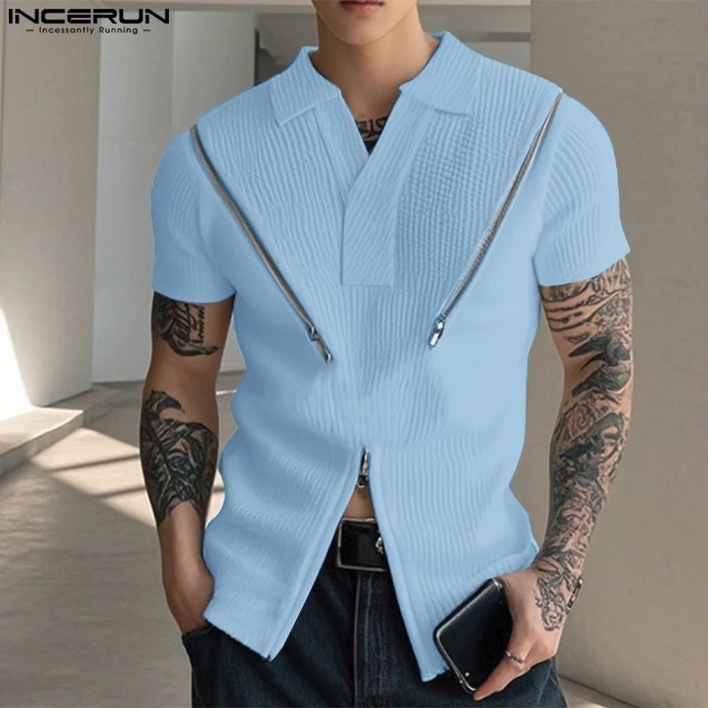 INCERUN بلايز الكورية نمط موضة الرجال تفكيك المعادن سستة الملمس قمصان الصيف الشارع الشهير التلبيب بلوزة بأكمام قصيرة