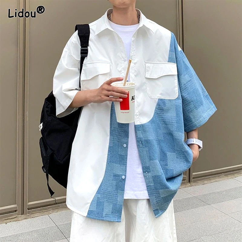 ملابس رجالية موضة 2023 ملابس الشارع الشهير فضفاضة غير رسمية بجيوب وياقة مقلوبة أزرار غير متماثلة قمصان قصيرة الأكمام وسيم