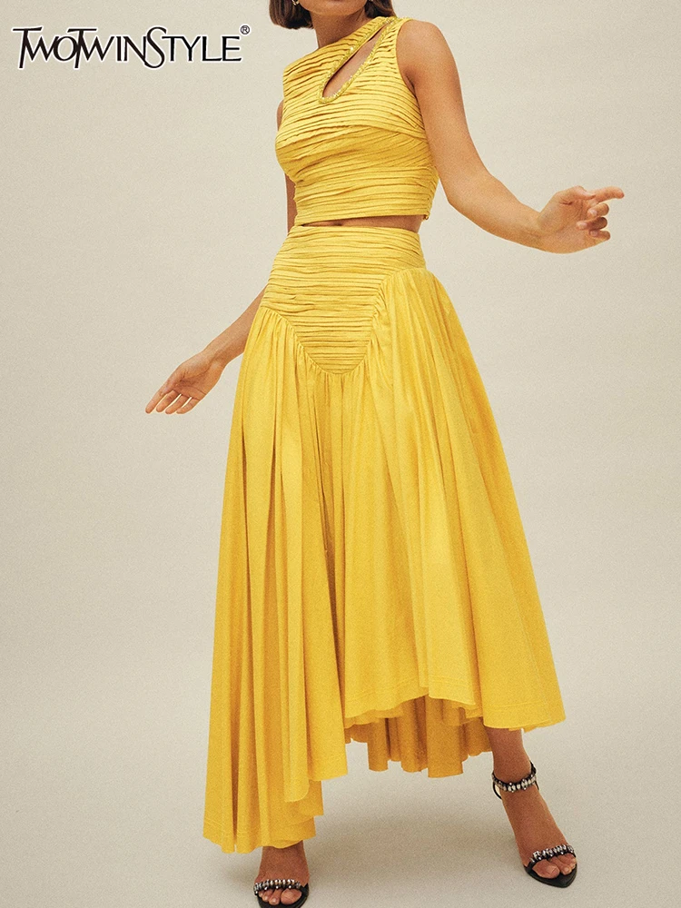 TWOTWINSTYLE سليم قطعتين مجموعات للنساء س الرقبة أكمام غير النظامية الجوف خارج أعلى ألف خط مطوي تنورة مجموعة الموضة الإناث