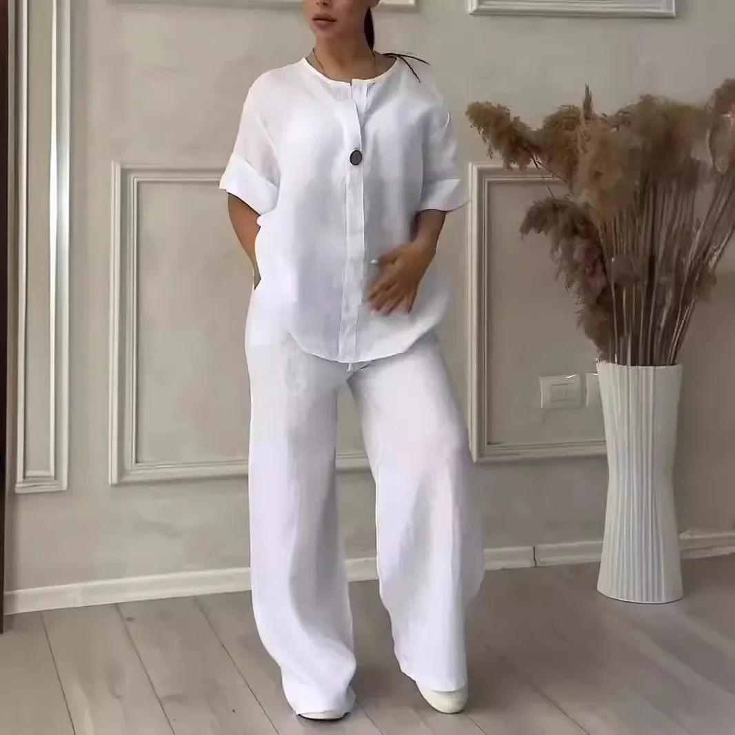 2025 أمازون أوروبا وأمريكا التجارة الخارجية المرأة فضفاضة تناسب القطن الكتان دعوى المألوف الخامس الرقبة قيعان جرس عادية